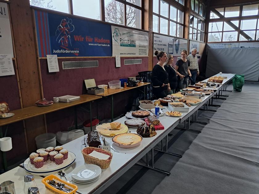 Zwischen den Randoris war für alle Anwesenden ausreichend Zeit sich am Essensbuffet zu bedienen, das mit zahlreichen Kuchenspenden und anderen Köstlichkeiten eine große Auswahl für Kinder und Erwachsene bot.